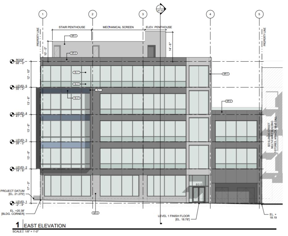 The project site is a parcel spanning an area of 5,500 square feet. The project proposes a five-story building with a basement, offering spaces for office and laboratory use. The building will house spaces for laboratory use spanning 16,132 square feet and an office area measuring an area of 8,684 square feet. Open usable space spanning an area of 2,130 square feet is also proposed. Ten bicycle parking spaces will be available on the site. The building will feature a 500 square-foot solar roof.